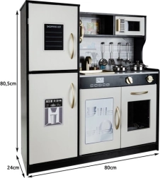 Stijlvolle houten XL keuken van KRUZZEL in zwart, wit en goud brengt kinderen realistisch kookplezier. Voorzien van LED-verlichting, geluidseffecten van de branders, bewegende elementen en rijk meegeleverd accessoires (pan, koekenpan, deksel, 4 lepels). Uitneembare gootsteen, oven, magnetron en opbergkastjes met “klik” stimuleren creativiteit, leren door te spelen en rollenspel.