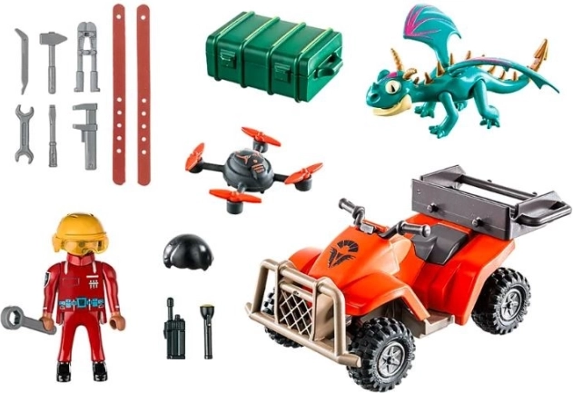 - Inhoud van de set: figuur Phil Baker, draak Angstaanjagende Terreur, quad (ATV) met terugtrekmotor, drone, gereedschapsset en accessoires.