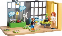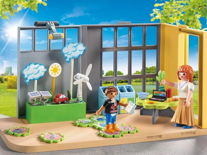 Onderdeel van de set zijn bakken voor gescheiden afval, planten, ecologische decoraties, elementen van “groene” infrastructuur en schooluitrusting. De set is compatibel met andere PLAYMOBIL-bouwsets (bijv. uitbreidingen voor klaslokalen), zodat je hem gemakkelijk koppelt tot een grotere schoolwereld.