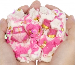 De roze en witte kinetische zand stelt kinderen in staat om vormen naar hun eigen fantasie te creëren en te vormen. Het zand bevat ook kleine decoratieve elementen.