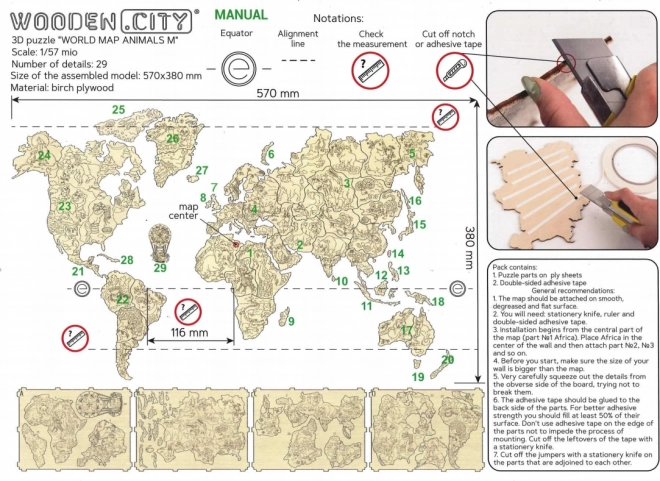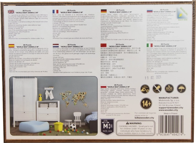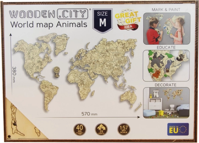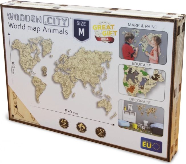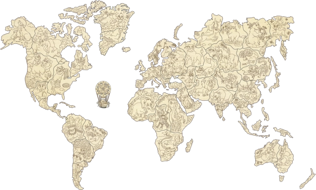 Ontdek de wereld op een speelse manier. De houten kaart met dieren op schaal 1:57 miljoen is met laser precisie uitgesneden uit berkenmultiplex, waardoor ze uitblinkt door strakke lijnen en de natuurlijke houtnerf. Perfect als decoratie én als leermiddel – kinderen breiden spelenderwijs hun kennis uit over continenten, oceanen en dieren.