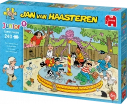 Ontdek de wereld van speelse illustraties van Jan van Haasteren in de Junior-editie. Deze vrolijke scène in de setting van een kermis barst van de kleine grapjes en typische motieven van de maker – van een haaienvin tot onverwachte figuurtjes in de menigte. Dankzij de grotere, prettig vast te pakken stukjes is het leggen ook toegankelijk voor jongere kinderen.