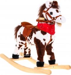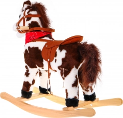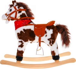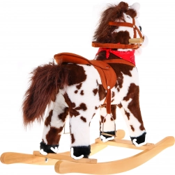 Dit stijlvolle hobbelpaard in realistische bruin-witte uitvoering is de ideale kameraad voor kleine ruiters. De stabiele houten constructie in combinatie met de zachte pluchen bekleding biedt comfort en veiligheid. Dankzij de houten handgrepen en stevige stijgbeugels stappen kinderen makkelijk op en genieten ze van een vloeiende, schommelende beweging.