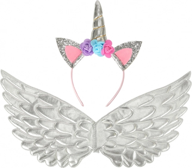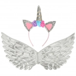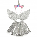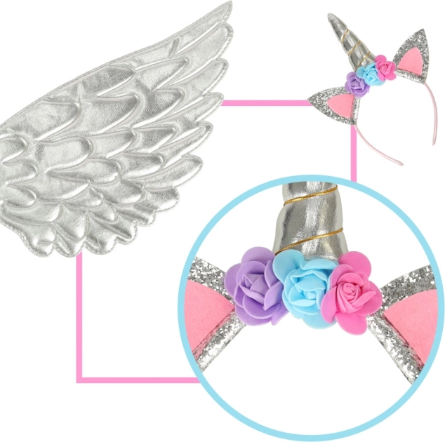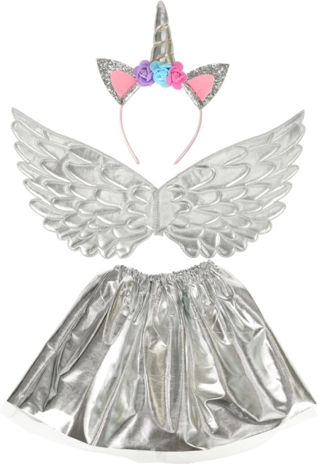 Dit prachtige kostuum laat je je kind veranderen in een unieke eenhoorn. Het bestaat uit een zilveren rok, elegante vleugels en een gedetailleerde diadeem met roosjes. Ideaal voor elke gelegenheid waarop je kind van een sprookjesspel kan genieten.