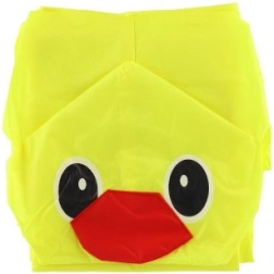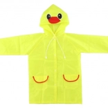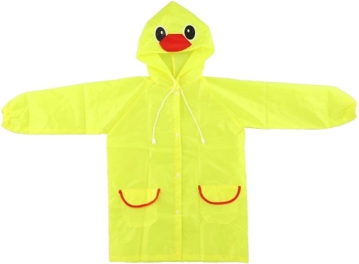 De regenjas is voorzien van een capuchon met ogen en snavel, waardoor elke regenachtige dag een leuke gebeurtenis wordt.