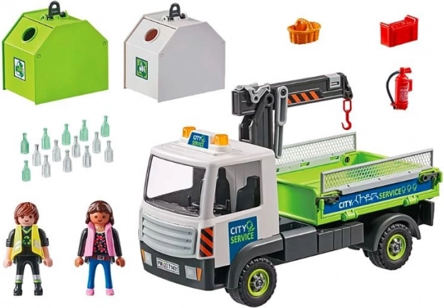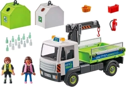 Grote kraan tilt moeiteloos de container met flessen en laadt deze op de aanhanger van de vrachtwagen. Dankzij talrijke realistische details en functies stimuleren deze sets uit de PLAYMOBIL City Life-serie kinderen vanaf 4 jaar om via spel te leren over milieubescherming.
