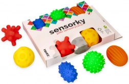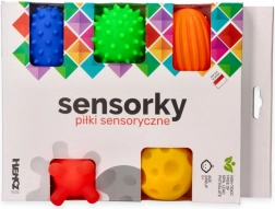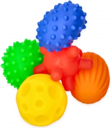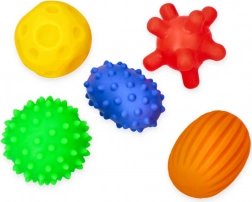 Set van 5 kleurrijke sensorische balletjes met bobbels, stekeltjes en groeven ondersteunt het waarnemen van vormen en structuren, concentratie en de natuurlijke zintuiglijke ontwikkeling. Dankzij het zachte materiaal zijn de balletjes makkelijk vast te pakken met kleine handjes en geschikt om mee te spelen thuis, op een kleed of in bad.