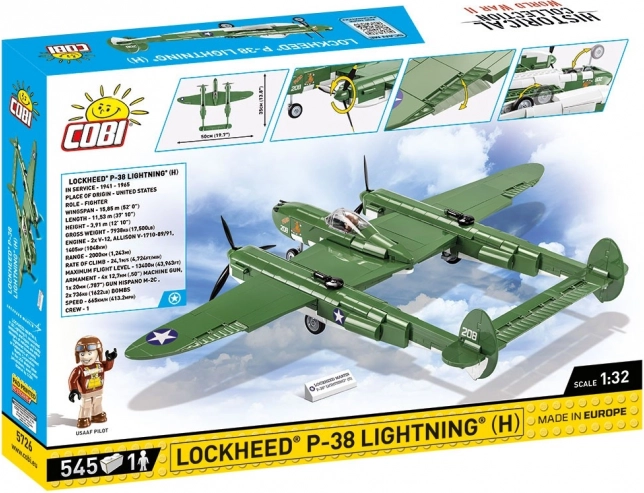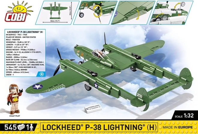 Bouw de legendarische Amerikaanse jager uit de Tweede Wereldoorlog – LOCKHEED P‑38 LIGHTNING op schaal 1:32 van COBI. De set bevat 545 onderdelen, gedetailleerde prints zonder stickers, bewegende elementen (propellers, kleppen, landingsgestel) en een te openen cockpit met een pilotenminifiguur. De officiële LOCKHEED MARTIN-licentie garandeert een getrouwe weergave van het iconische “Flying Frame”.