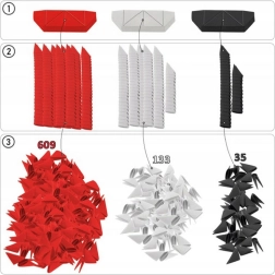 - Papieren modules (777 stuks), stickervel (1 stuk), gedrukte instructies (1 stuk)
