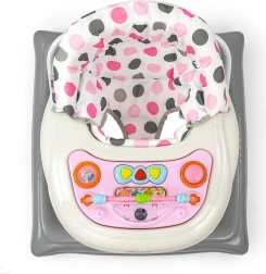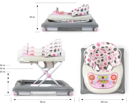 Het product heeft een educatief paneel met allerlei verrassingen voor kleine ontdekkers: lichtjes, piepers, melodieën, een rammelaar, knoppen en andere bewegende elementen. Na het verwijderen van het paneel uit de kuip van het loopstoeltje kan het als een los speelgoed worden gebruikt, bijvoorbeeld als reisgenootje, en het bovenste deel kan dienen als speelblad.