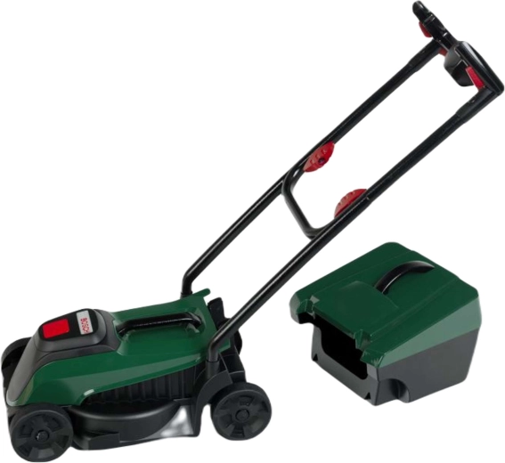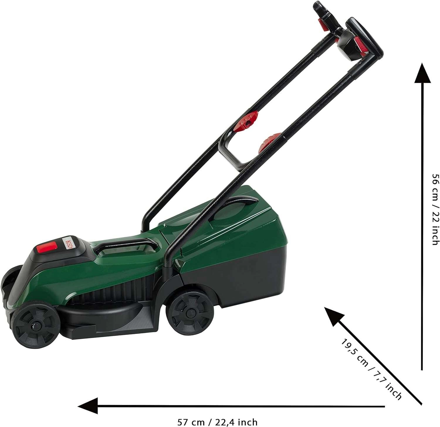 Realistische kinderspeelgoed grasmaaier in donkergroen met een Bosch licht- en geluidsmodule die kleine tuiniers zal verrassen. Na het indrukken van de knop licht het BOSCH-logo op en hoor je authentieke motor- en maai-geluiden. Dankzij het lage gewicht, de afneembare opvangbak en de bewegende wielen is hij ideaal om mee te spelen, zowel binnen als buiten.