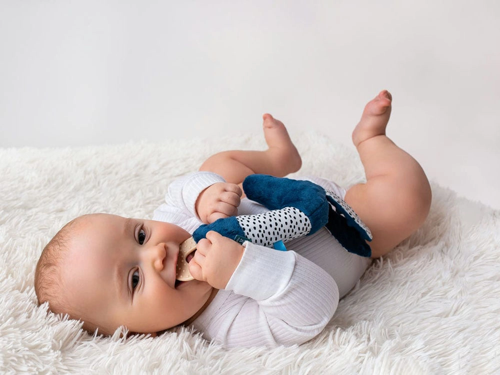 Jamiś is een superzachte knuffel die zowel vermaakt als kalmeert. Contrasterende materialen trekken de aandacht van pasgeborenen, de pieper en knisperende oortjes stimuleren het gehoor, terwijl de getextureerde siliconen bijtring het tandvlees zachtjes masseert bij doorkomende tandjes. Dankzij het lichte ontwerp en de gemakkelijk vast te pakken vorm is het ideaal voor kleine handjes.