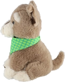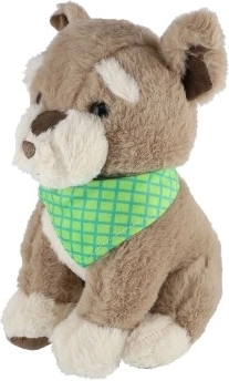 Schattig pluchen hondje Azorek in bruin‑crème met een geruite sjaal, zacht, knuffelig en ideaal om te knuffelen. Een geweldige metgezel voor kinderen vanaf de geboorte, die een gevoel van veiligheid biedt, emotionele ontwikkeling stimuleert en makkelijk te onderhouden is.