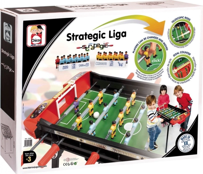 Geniet van het plezier met kinder tafelvoetbal Chicos Strategic League, ideaal voor kleine voetbalfans. Dankzij de verwisselbare spelers kun je je eigen strategie creëren.
