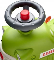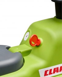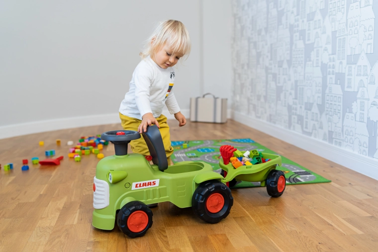 Kinderloopvoertuig in de stijl van een CLAAS-tractor met een ergonomisch zadel met rugleuning, een werkend stuur met claxon en een aanhanger met harkje en schepje. Gemaakt in Frankrijk van hoogwaardig, zeer duurzaam plastic met 50% gerecycled materiaal, getest volgens Europese normen tot 30 kg.