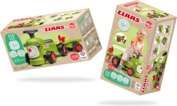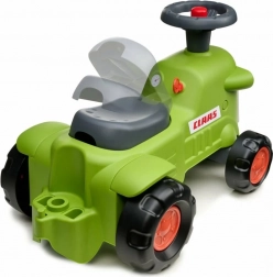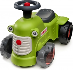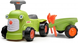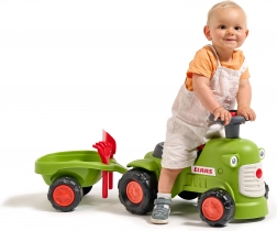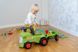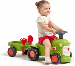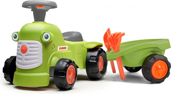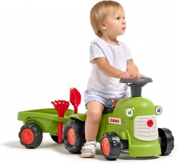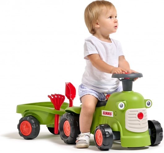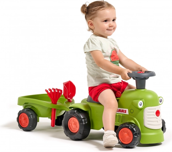 Ontdek de robuuste looptractor in het design van het bekende landbouwmerk CLAAS in lichtgroen. Kinderen zullen genieten van de eenvoudige bediening met het stuur en de claxon, terwijl ouders het veilige en stabiele ontwerp waarderen. De aanhanger biedt ruimte voor speelgoed en is uitgerust met praktische accessoires – harkje en schepje.