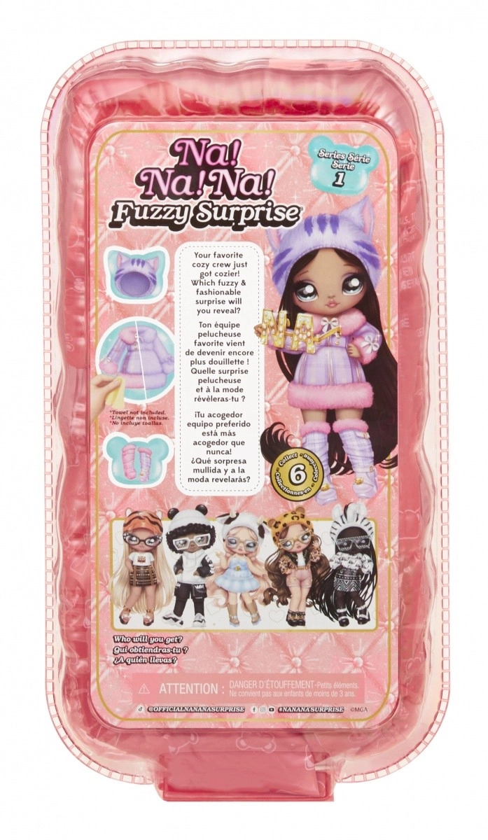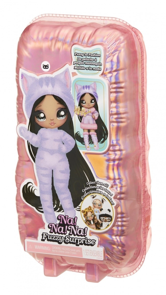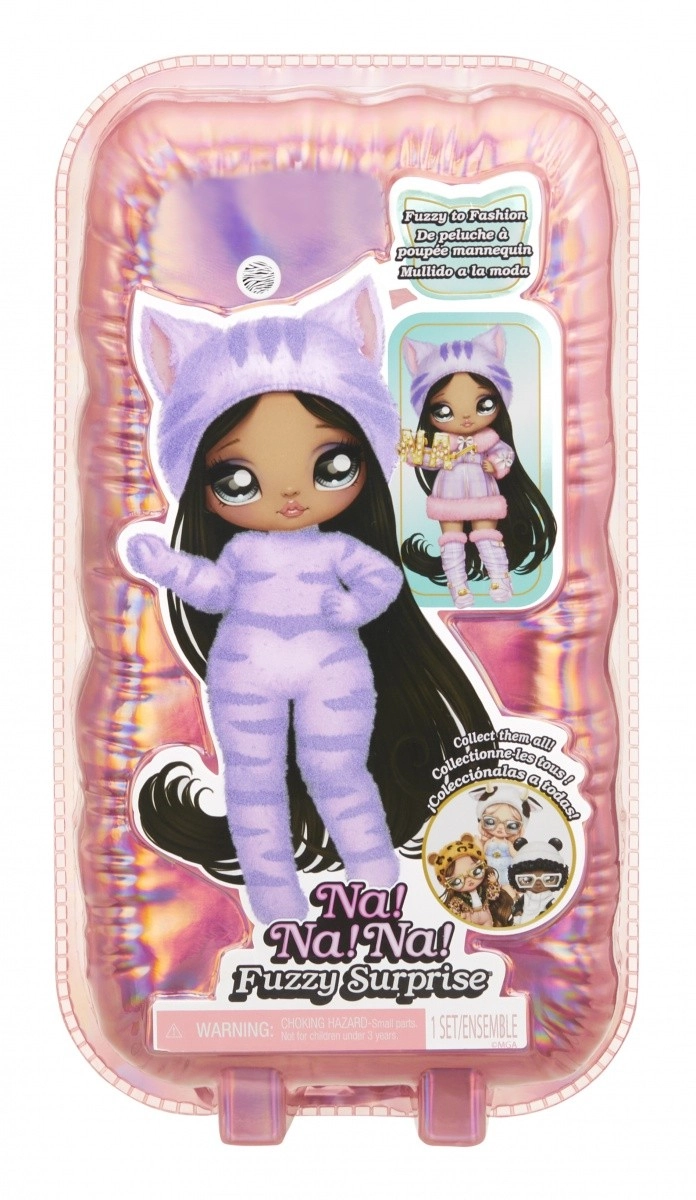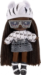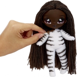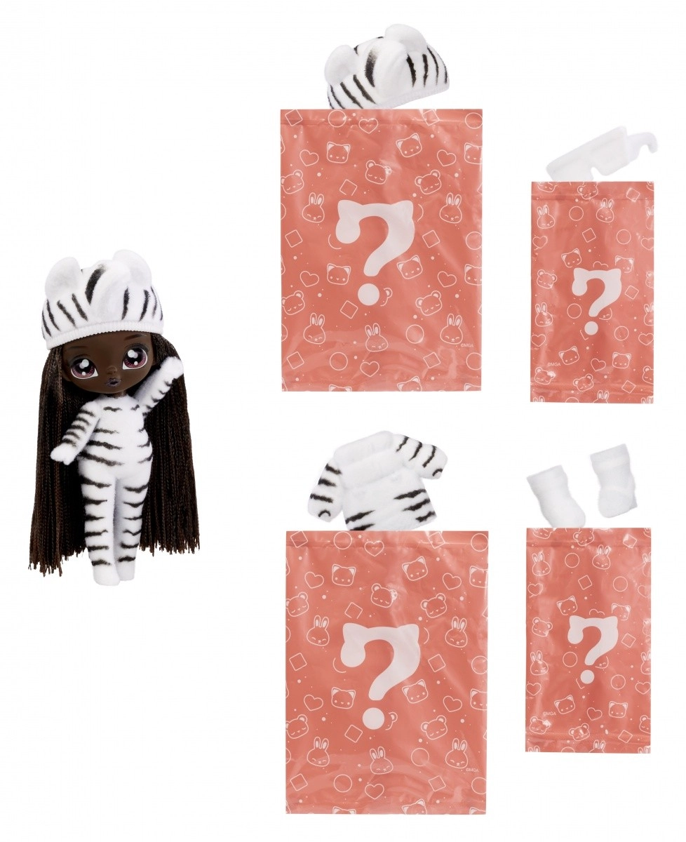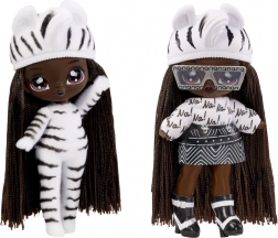 Beleef een nieuwe manier van onthullen met de NA! NA! NA! Fuzzy Surprise-collectie. Elke 17 cm pop heeft een zacht geflockt lichaam dat je eenvoudig afneemt met een vochtige doek om haar unieke look, expressieve gezichtprints en modieuze accessoires te onthullen. Zebra Girl valt op door haar zwart-witte dierenstijl, afneembare muts met oortjes en opvallende bril.