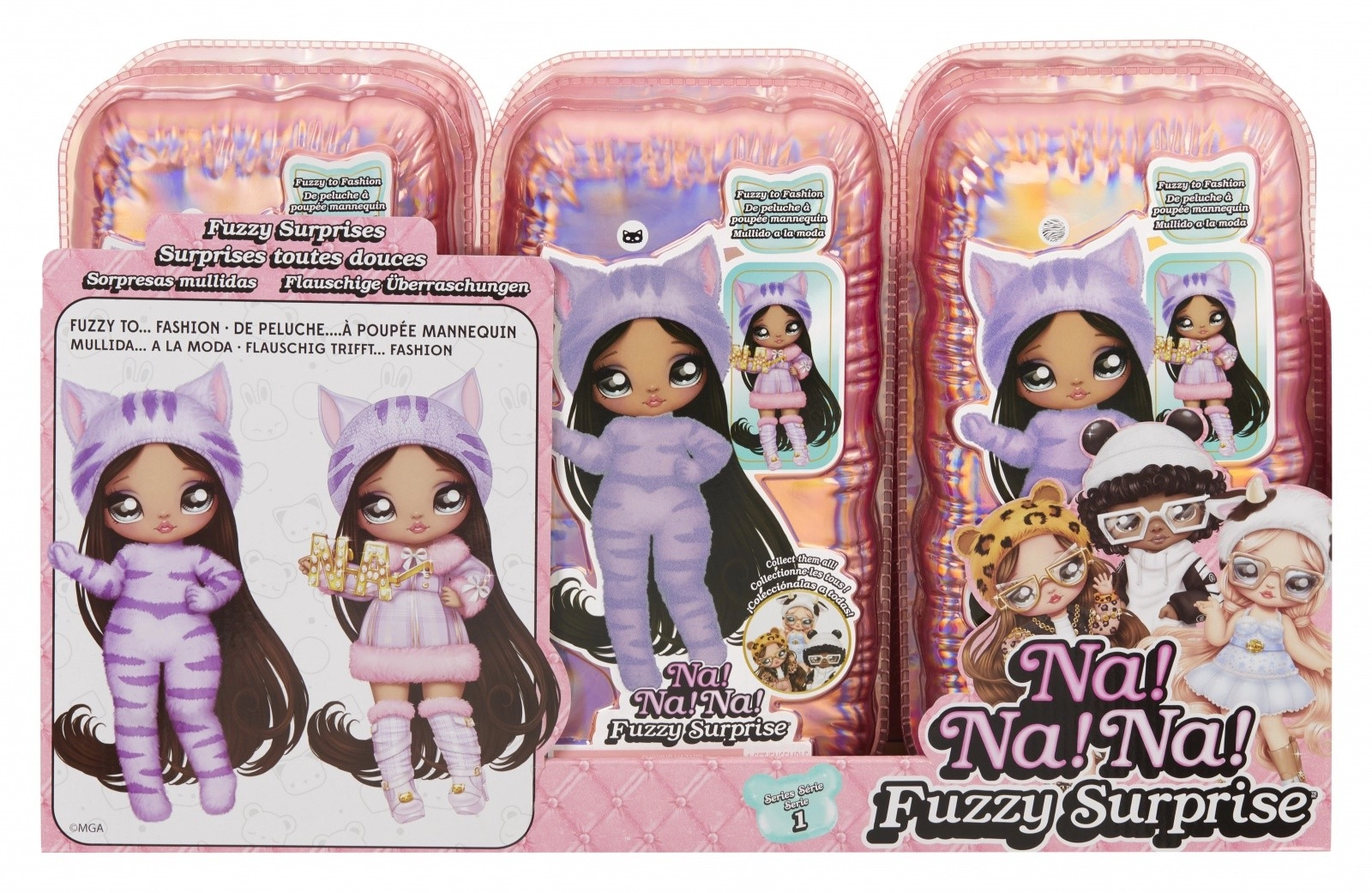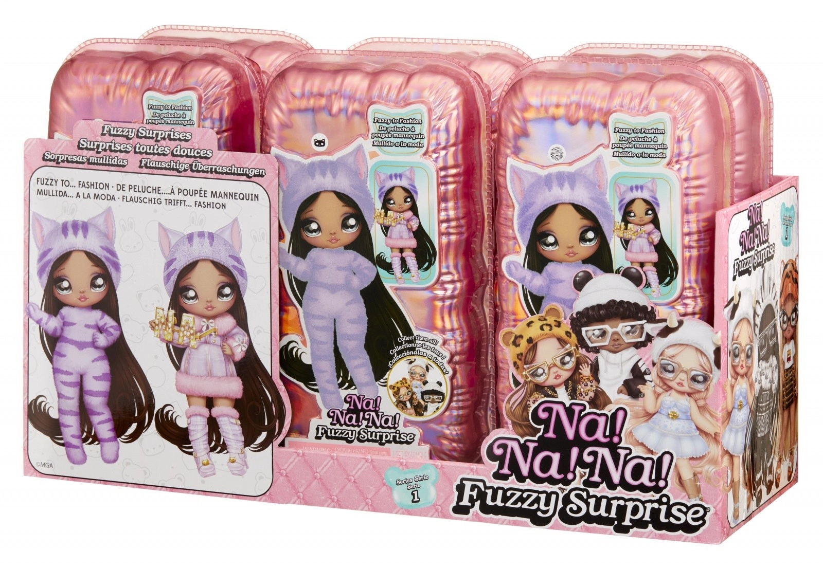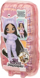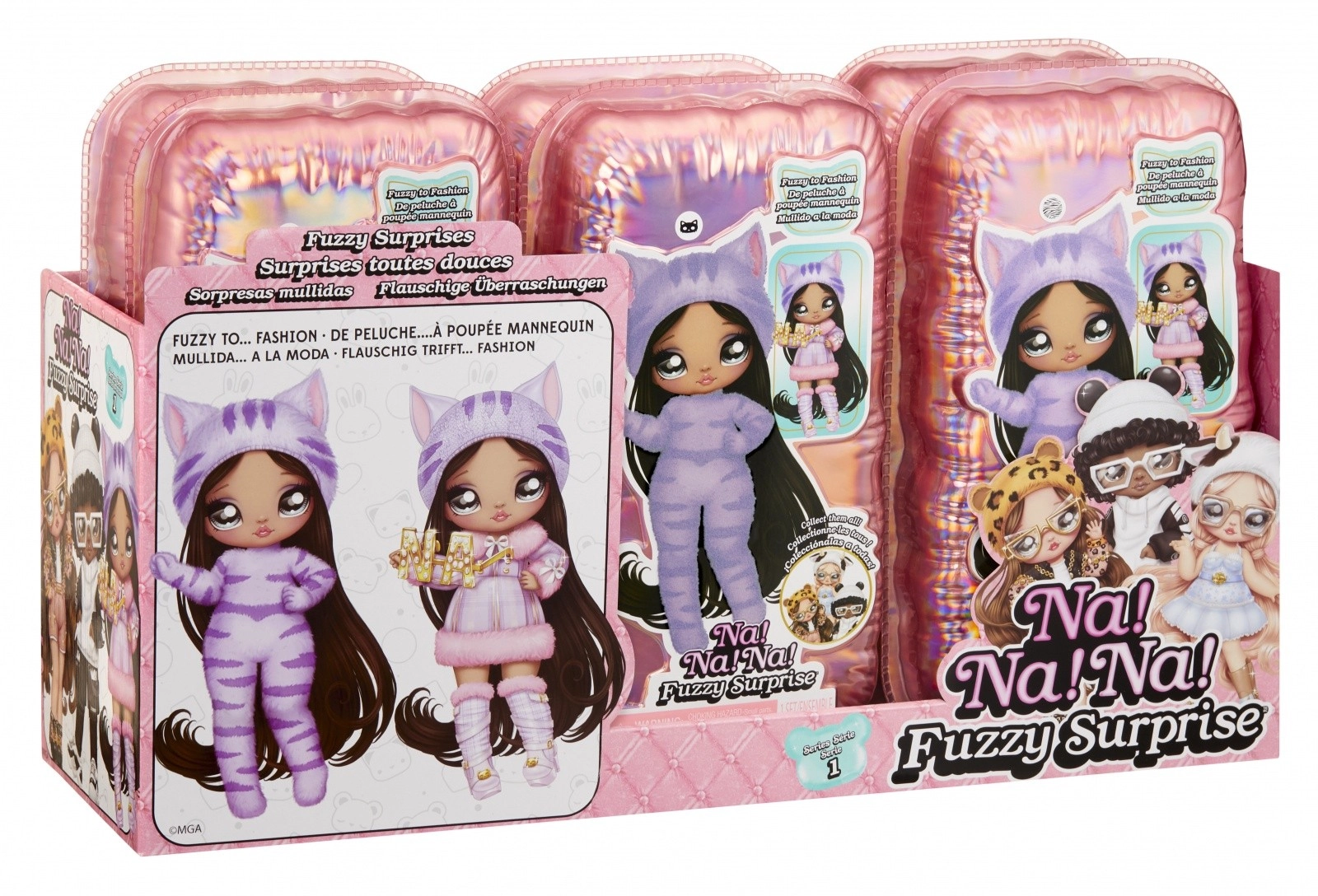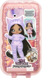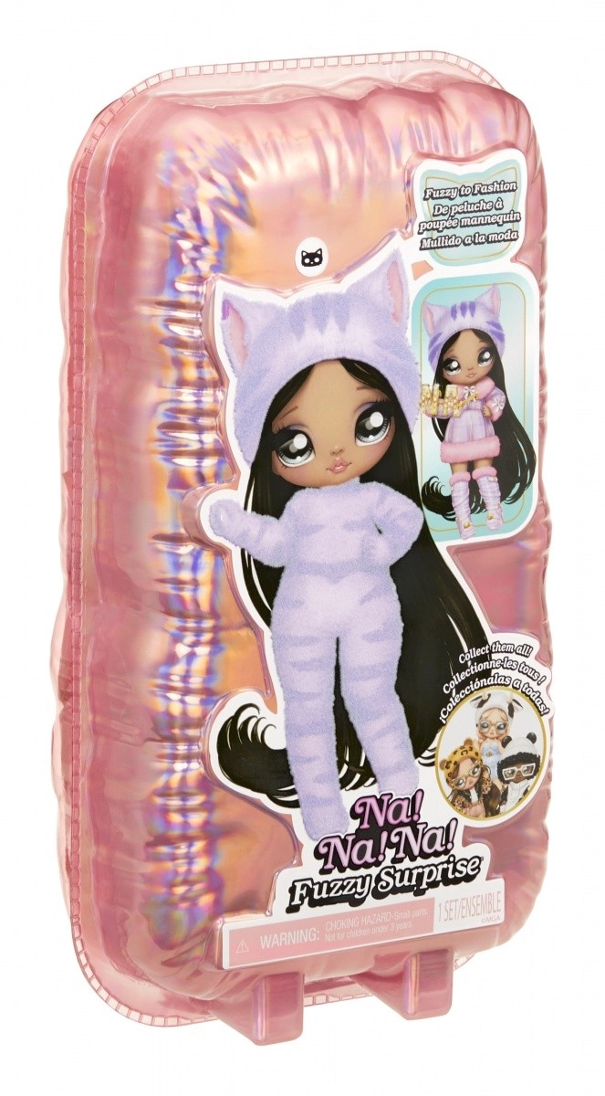 Beleef een nieuwe manier van onthullen met de NA! NA! NA! Fuzzy Surprise-collectie. Elke 17 cm pop heeft een zacht geflockt lichaam dat je eenvoudig afneemt met een vochtige doek om haar unieke look, expressieve gezichtprints en modieuze accessoires te onthullen. Zebra Girl valt op door haar zwart-witte dierenstijl, afneembare muts met oortjes en opvallende bril.