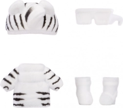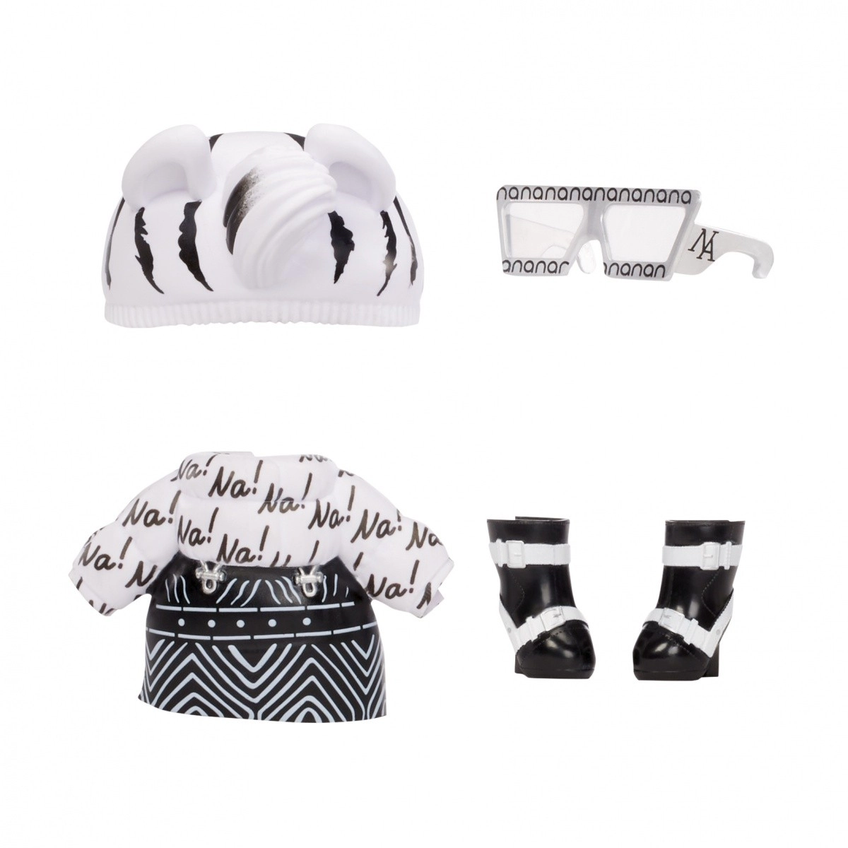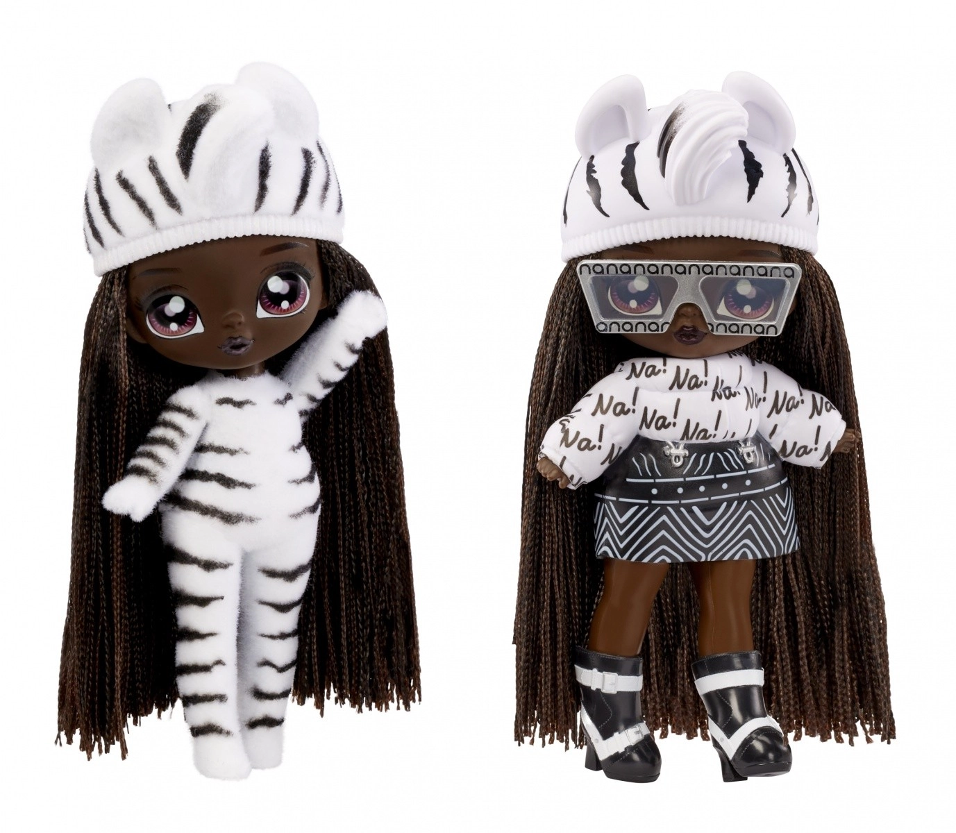 Zebra Girl komt in een zwart-witte dierenlook met rok, “Na!”-top, muts met oortjes, zonnebril en schoenen – ideaal voor modespeelplezier.
