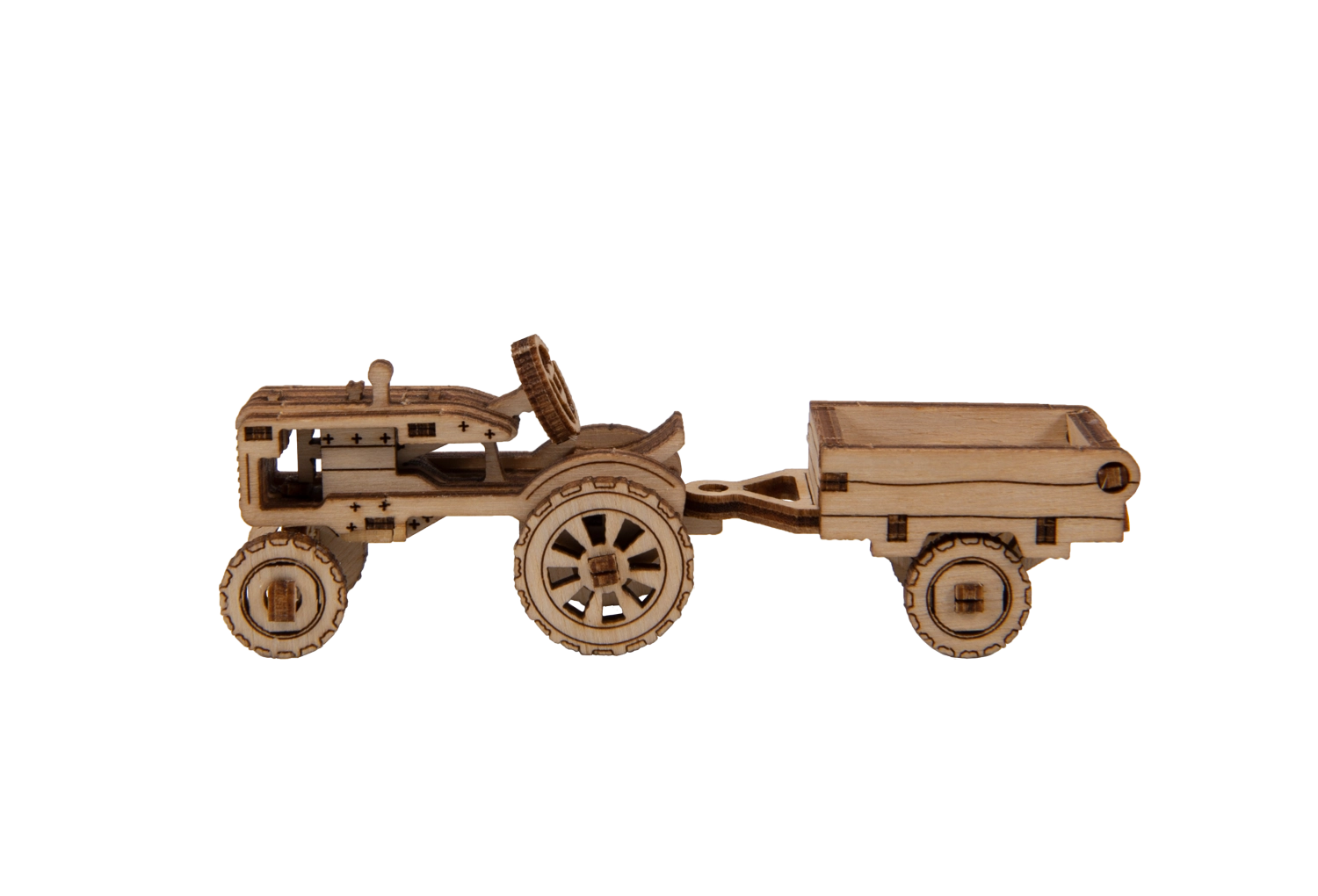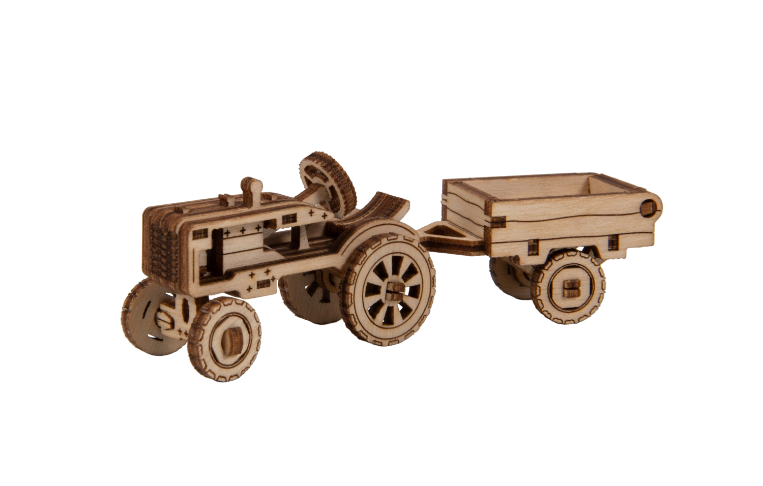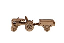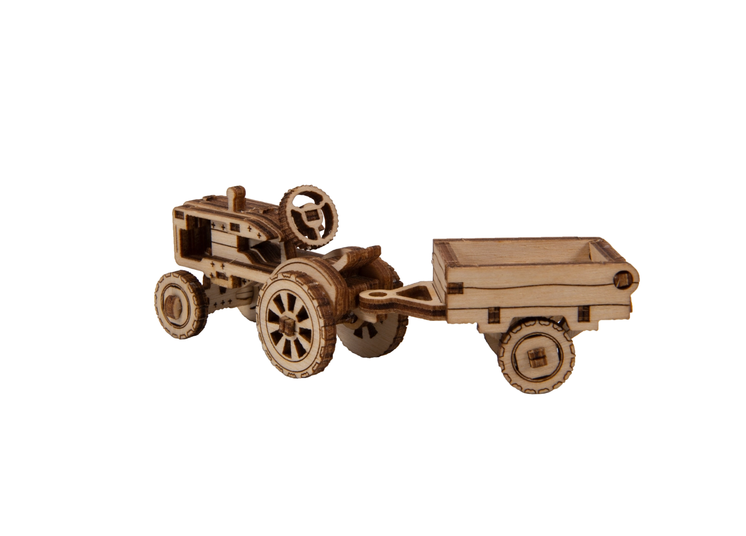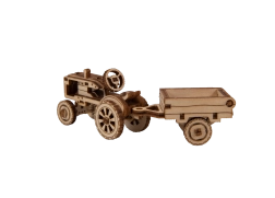 Het tractormodel met aanhanger heeft bewegende wielen en rijke gegraveerde details. De aanhanger kan kantelen – ideaal als indrukwekkende houten decoratie.