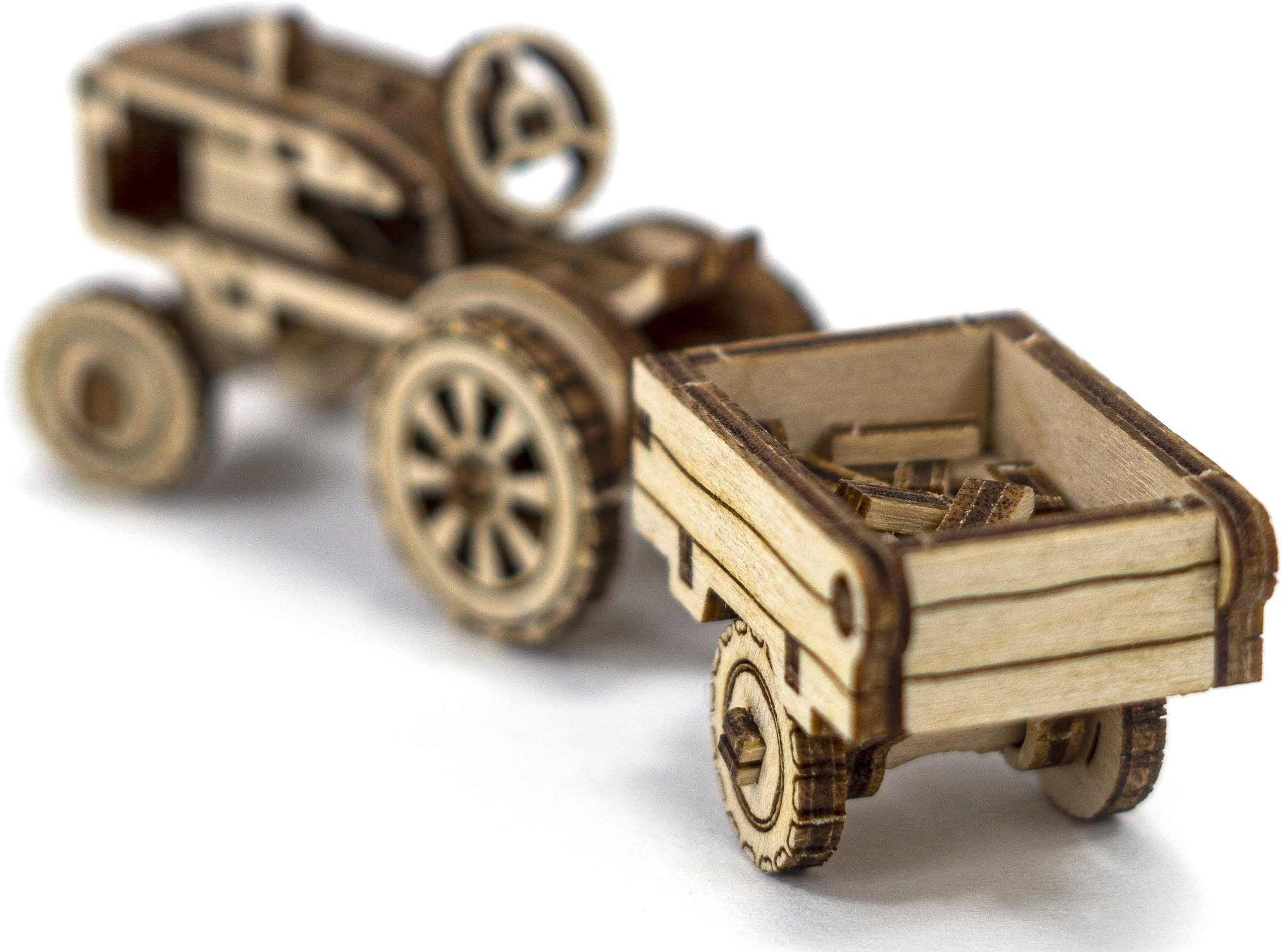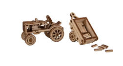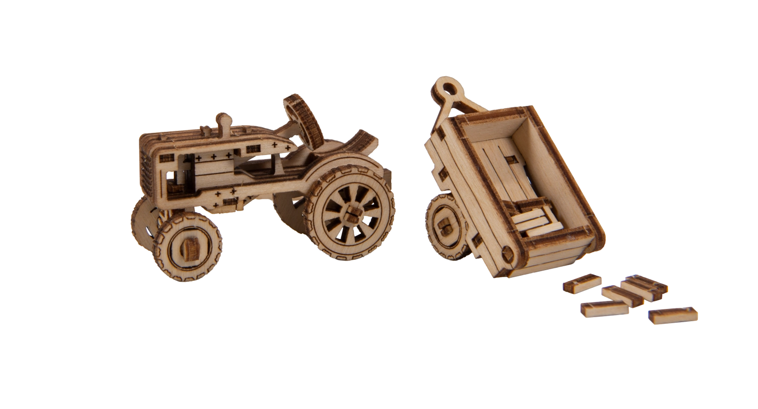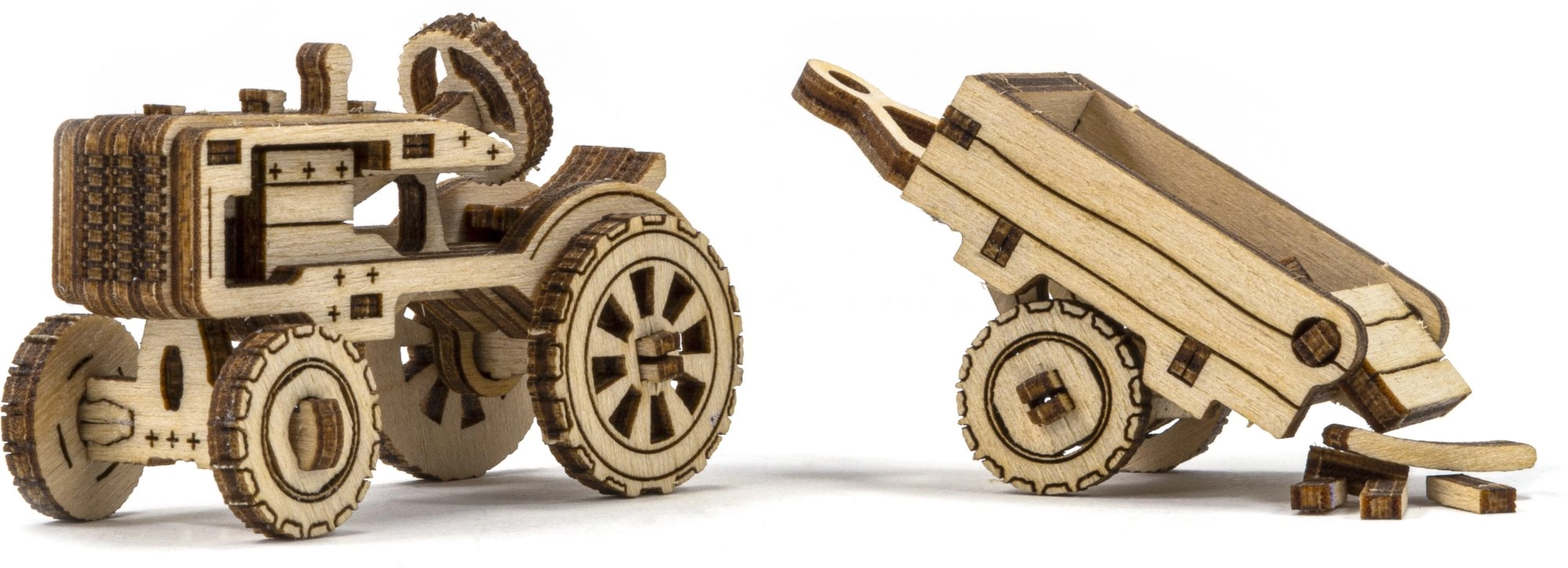 Het tractormodel met aanhanger heeft bewegende wielen en rijke gegraveerde details. De aanhanger kan kantelen – ideaal als indrukwekkende houten decoratie.