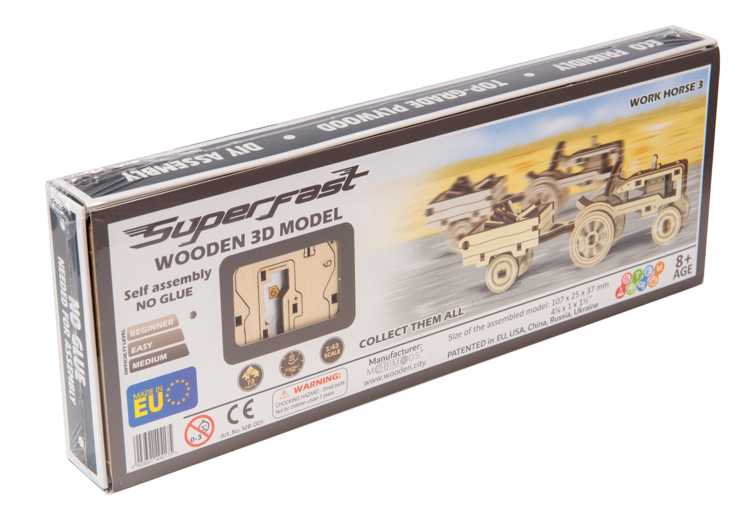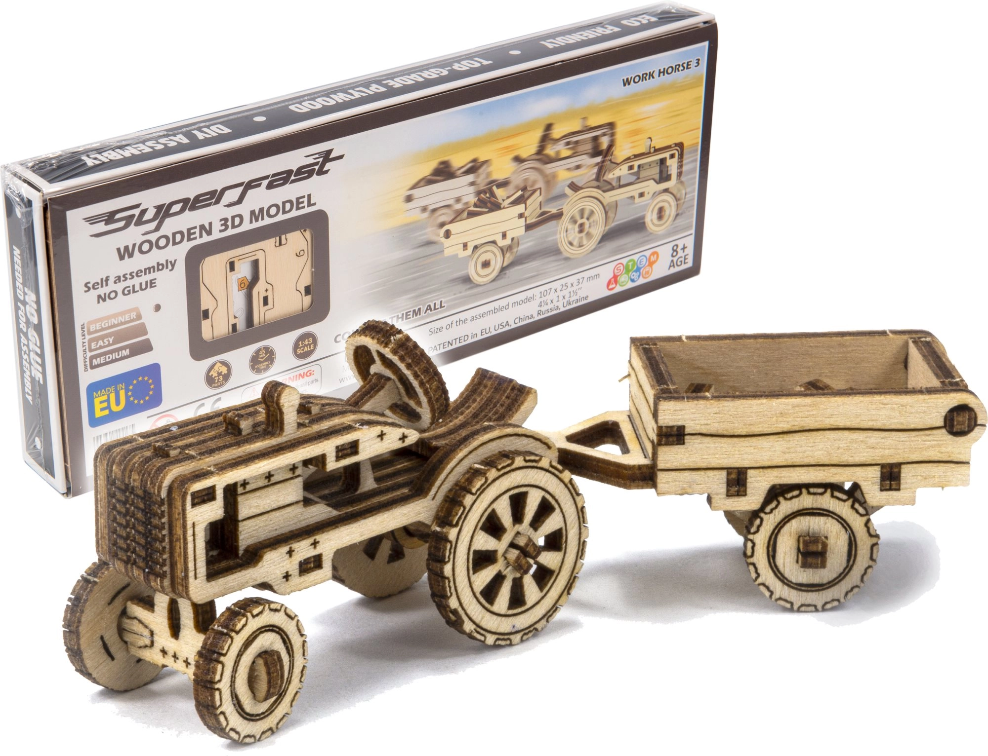 Dit nauwkeurig uitgewerkte model “Work Horse 3” is geïnspireerd op beroemde Amerikaanse tractors en biedt een aantrekkelijke mix van creatieve fun en ontspanning. De onderdelen zijn laser-voorgestanst, dus je hebt geen lijm nodig en geen schroeven – alles klikt schoon in elkaar en het resultaat is een realistische tractor met kantelbare aanhanger.