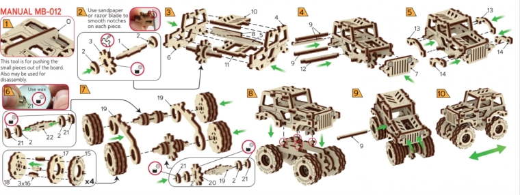 Het model is gemaakt van hoogwaardige multiplex, wordt zonder lijm en gereedschap in elkaar gezet en is ook geschikt voor beginners. Voor een soepele mechaniek volstaat het om tandwielen en assen licht te smeren met was (bijv. van een kaars), waardoor wrijving vermindert en de levensduur toeneemt.