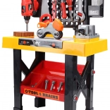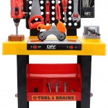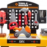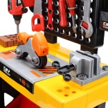 Boormachine, zaag, hamer, schroevendraaiers, sleutels, schroeven, moeren en koppelstukken – alles wat kinderen nodig hebben voor creatief bouwen en rollenspel.
