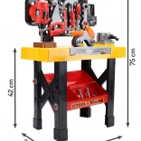 Deze realistische kinderwerkbank biedt alles wat een kleine klusser nodig heeft. Het robuuste tafelblad met gaten voor schroeven, de functionele bankschroef en de verticale boormachine geven het spel authenticiteit. De onderste legplank, vakken en haakjes houden al het gereedschap netjes op zijn plek.