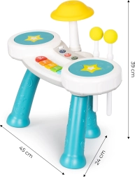 Bijgeleverd zijn twee drumstokken met zachte uiteinden, waarmee kinderen kunnen spelen als op echte drums: sla eenvoudig op de drums of de bekkens en hoor het geluid. De speelgoedset biedt veel muzikale modi en voorgeprogrammeerde melodieën, wat zorgt voor eindeloos plezier en het stimuleren van creativiteit.
