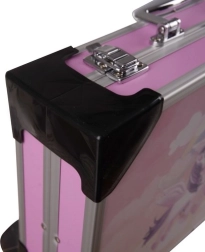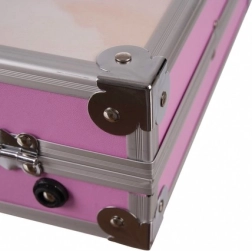 De roze koffer met metalen randen, hoeken en sluitingen houdt orde en beschermt de materialen tijdens transport, thuis en onderweg.