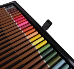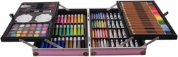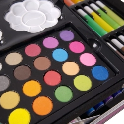 De inhoud is samengesteld om verschillende technieken te dekken – van subtiele schetsen en krachtige lijnen met stiften tot dekkend schilderen met acryl of lichte aquarelverlopen. Dankzij de stevige koffer met metalen verstevigingen en sluitingen is vervoeren veilig en comfortabel, thuis, op school of onderweg.