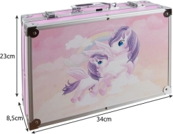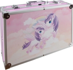 De stijlvolle roze koffer met eenhoorns bevat een uitgebreide set van 144 onderdelen voor tekenen en schilderen. Alles heeft zijn plek in overzichtelijke vakken, zodat je orde in je materialen bewaart en alles snel terugvindt. De set stimuleert creativiteit, fijne motoriek en concentratie, en biedt urenlang plezier, zowel individueel als in groepsverband.