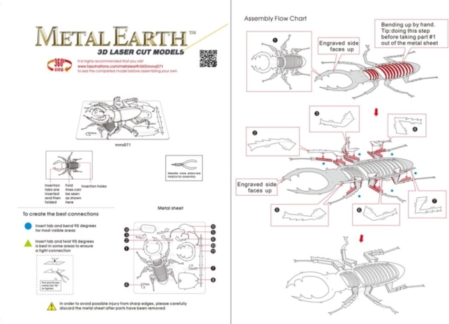 Haal de afzonderlijke onderdelen uit de metalen plaatjes; gebruik indien nodig een kleine zijkniptang (niet inbegrepen). De onderdelen worden met elkaar verbonden via vergrendelingen bestaande uit een lipje en een opening. Buig het lipje met een kleine, fijne tang (niet inbegrepen) en verbind stap voor stap alle vergrendelingen totdat er een zeer realistisch meesterwerk ontstaat!