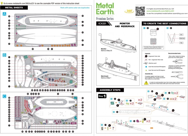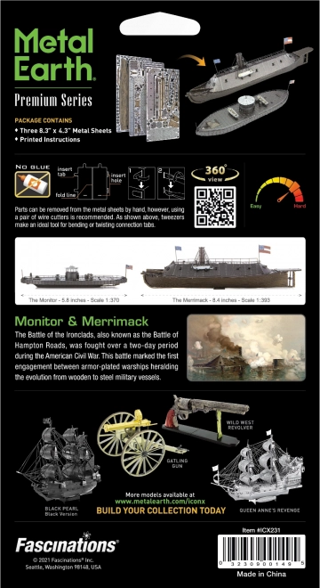 Bouw twee legendarische ironclads van roestvrij staal in de premium serie METAL EARTH ICONX. Dankzij lasergravure en kleurbedrukte plaatjes ontstaan realistische miniaturen van de USS Monitor en CSS Virginia (Merrimack). De montage verloopt zonder lijm met behulp van vergrendelingen en buigen; een geïllustreerde handleiding is inbegrepen, gereedschap niet meegeleverd.