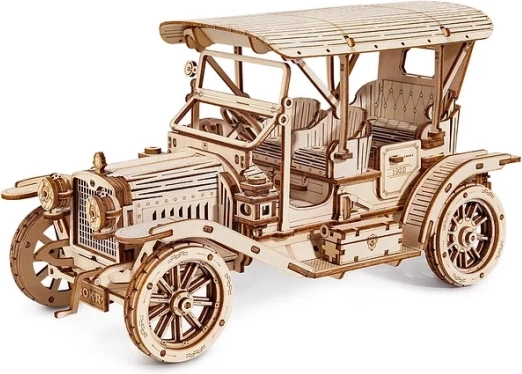 Het houten 3D puzzelmodel van een historisch voertuig van RoboTime is een nauwkeurige replica van vintage voertuigen uit het messingtijdperk, geïnspireerd door voertuigen uit de jaren 1910. Aerodynamische spatborden en elegante lijnen geven een uitstraling die doet denken aan met paarden getrokken koetsen, samen met authentieke details zoals de versnellingspook en comfortabele stoelen – dit alles draagt bij aan de uniciteit van dit model.