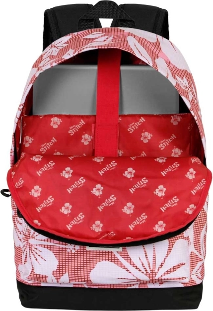Lichte stadsrugzak met Lilo & Stitch-motief in het rood, ideaal voor dagelijks praktisch gebruik. Biedt één vak met binnenvoering en een vak voor elektronische apparaten, een voorvak voor kleine spullen, verstelbare gewatteerde schouderbanden voor comfort en een achterste trolleyband voor gemakkelijk reizen. Het duurzame polyestermateriaal zorgt voor een lange levensduur.