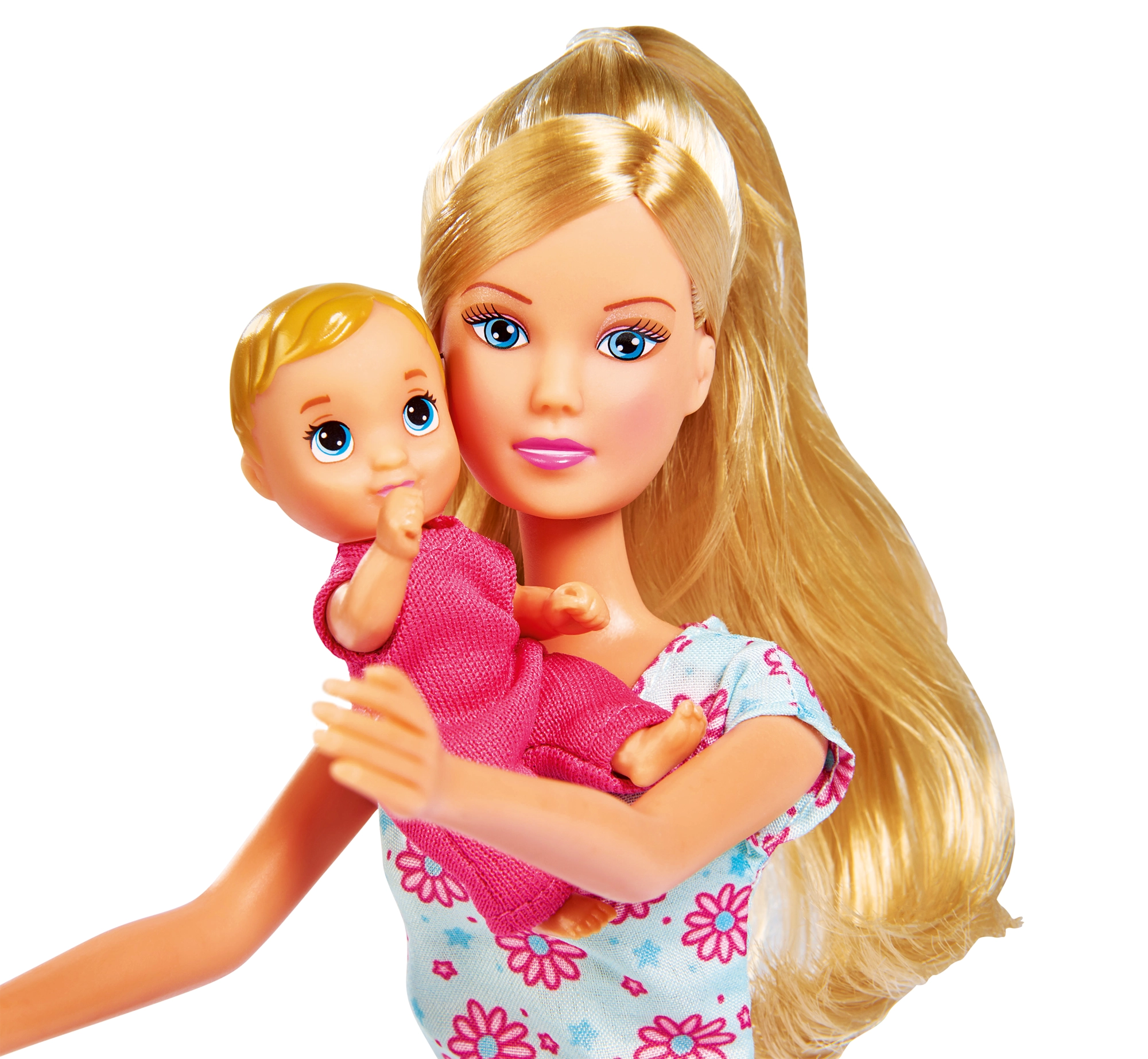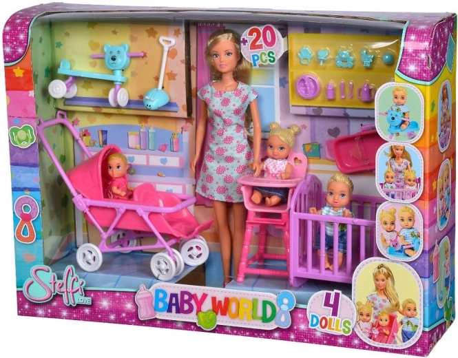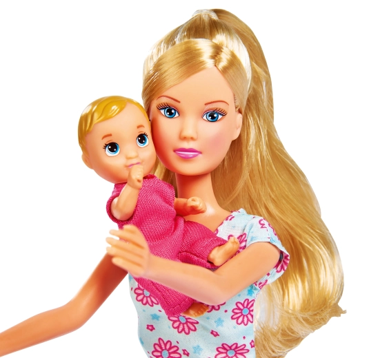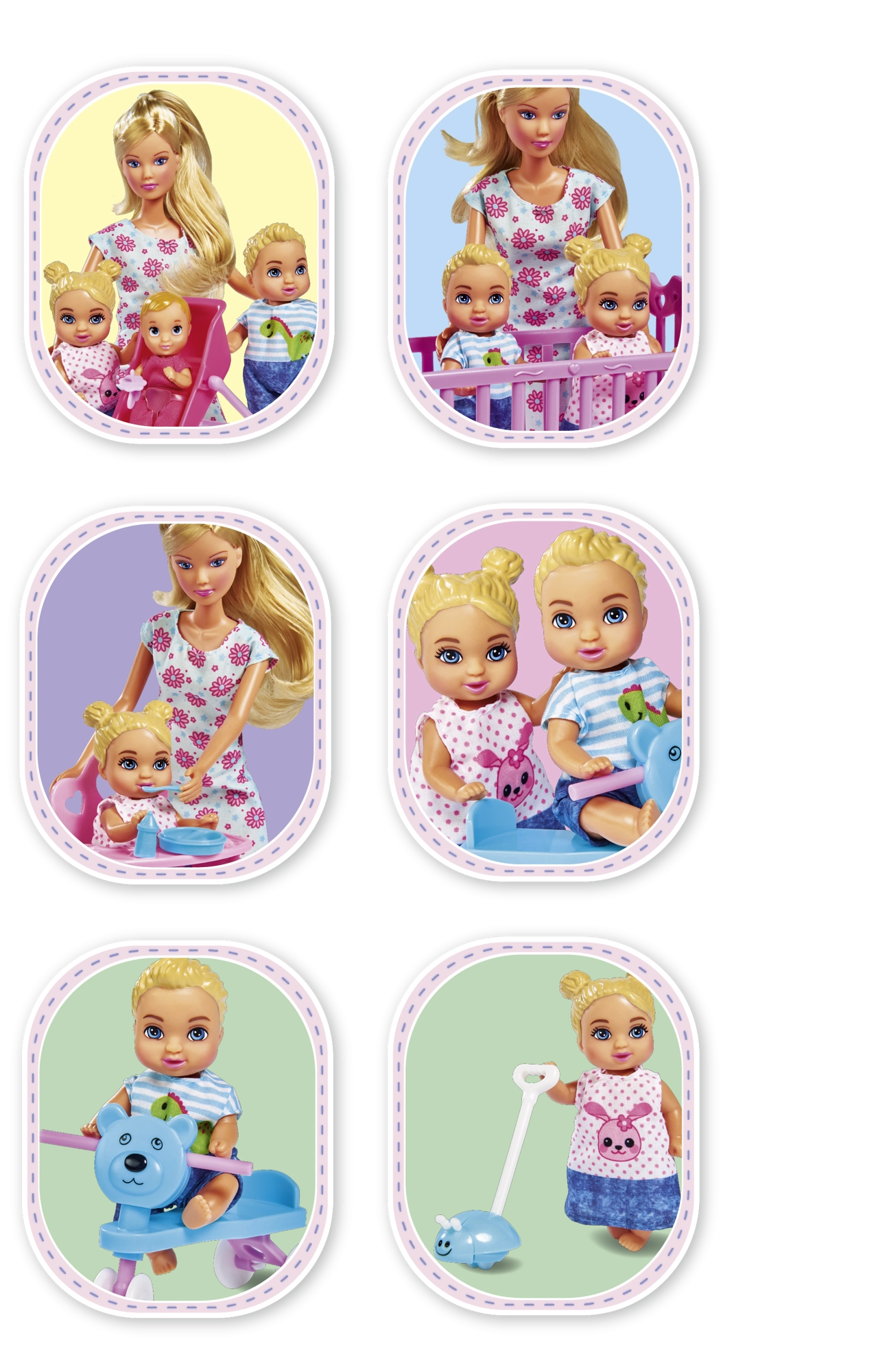 De geliefde pop STEFFI verschijnt als zorgzame mama met drie baby’s en een rijke uitrusting voor het kamertje. Dankzij de 2-in-1 kinderwagen (reiswieg + sportstand), het bedje, de kinderstoel en praktische kleinigheden spelen kinderen alle alledaagse situaties na – van voeden en in slaap wiegen tot uitstapjes.