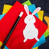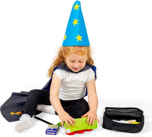 Alles wat je nodig hebt in één pakket: tas, cape, toverstaf, kaarten, bekers, hoed, konijntje, fiches en sjaaltjes. Kinderen kunnen meteen beginnen met goochelen en het publiek vermaken.