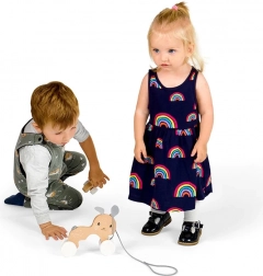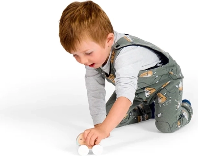 Vier stevige wielen met een geometrisch patroon rollen soepel over vlakke oppervlakken, terwijl het grijze trekkoord ook in kleine handjes goed vast te houden is. Het speelgoed helpt bij het ontwikkelen van behendigheid, balans en coördinatievaardigheden, en stimuleert actief bewegen en de fantasie.