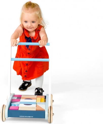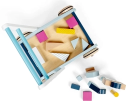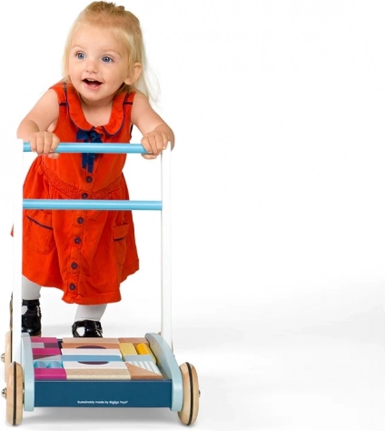 Stijlvolle houten loopwagen in pastelkleuren ondersteunt de eerste stapjes én creatief spel. Gemaakt van FSC-gecertificeerd hout, met een stabiele constructie en een makkelijk vast te pakken handgreep voor veilig lopen. Inclusief een set van 25 gekleurde blokken in verschillende vormen en formaten voor de ontwikkeling van motoriek, oog-handcoördinatie en herkennen van kleuren en vormen.