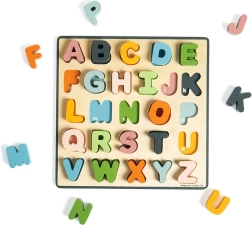 De houten puzzel met 26 kleurrijke letters is het perfecte hulpmiddel voor de eerste kennismaking met het alfabet. Elke letter heeft zijn eigen uitsparing in de bijpassende kleur, wat kinderen helpt bij het onthouden en het correct toewijzen. Dankzij de stevige, makkelijk vast te pakken stukken oefenen kinderen hun oog-handcoördinatie en concentratie.