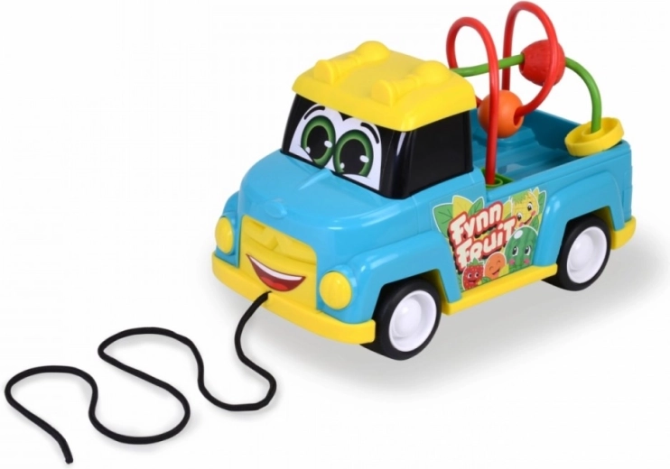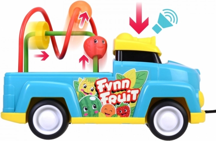 Een vrolijk voertuig met ogen en een koord om te trekken. In het achterste deel van het voertuig zit een doolhof met elementen die op stukjes fruit lijken. Bij het indrukken van de cabine klinkt bovendien een toetergeluid. Lengte 25 cm.