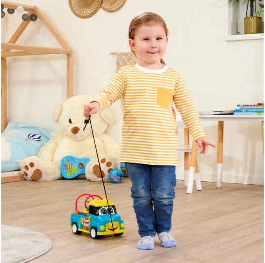 - Een ongewone combinatie van speelgoed die de zintuigen van kinderen actief stimuleert en de oog-handcoördinatie ontwikkelt, in de vorm van een auto met een trekkoord dat de motorische coördinatie van kinderen ondersteunt.