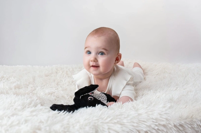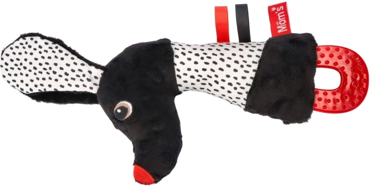 De zachte stoffen piep-bijtring Jammy van Mom's care is gemaakt met het oog op de allerkleinsten. In één speeltje hebben we een hele reeks prikkels samengebracht, speciaal afgestemd op de behoeften van je baby. Voor het naaien van de bijtring hebben we gecertificeerde stoffen met verschillende structuren gebruikt. Zo kan je kind de wereld ontdekken en de tastzin ontwikkelen. We denken ook aan de juiste ontwikkeling van het zicht. Het zwart-witte katoen dat op de rug en oren is gebruikt, bevordert de correcte waarneming van kleuren.
