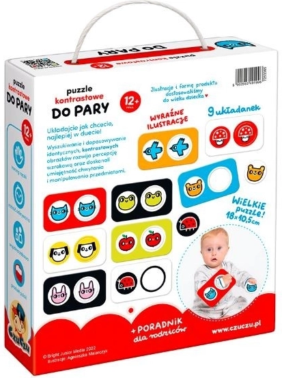 Ontdek de eerste puzzels voor de allerkleinsten: CzuCzu contrastrijke koppelpuzzels ontwikkelen de cognitieve, motorische en emotionele vaardigheden van kinderen vanaf 12 maanden. Grote stukken met duidelijke contrasterende illustraties en de mogelijkheid om de schijfjes vrij te verleggen nodigen uit tot spelenderwijs leren en samen ontdekken. In de doos vind je 9 paren (18 stukken) en een gids voor ouders met spelideeën.