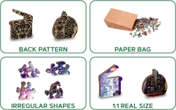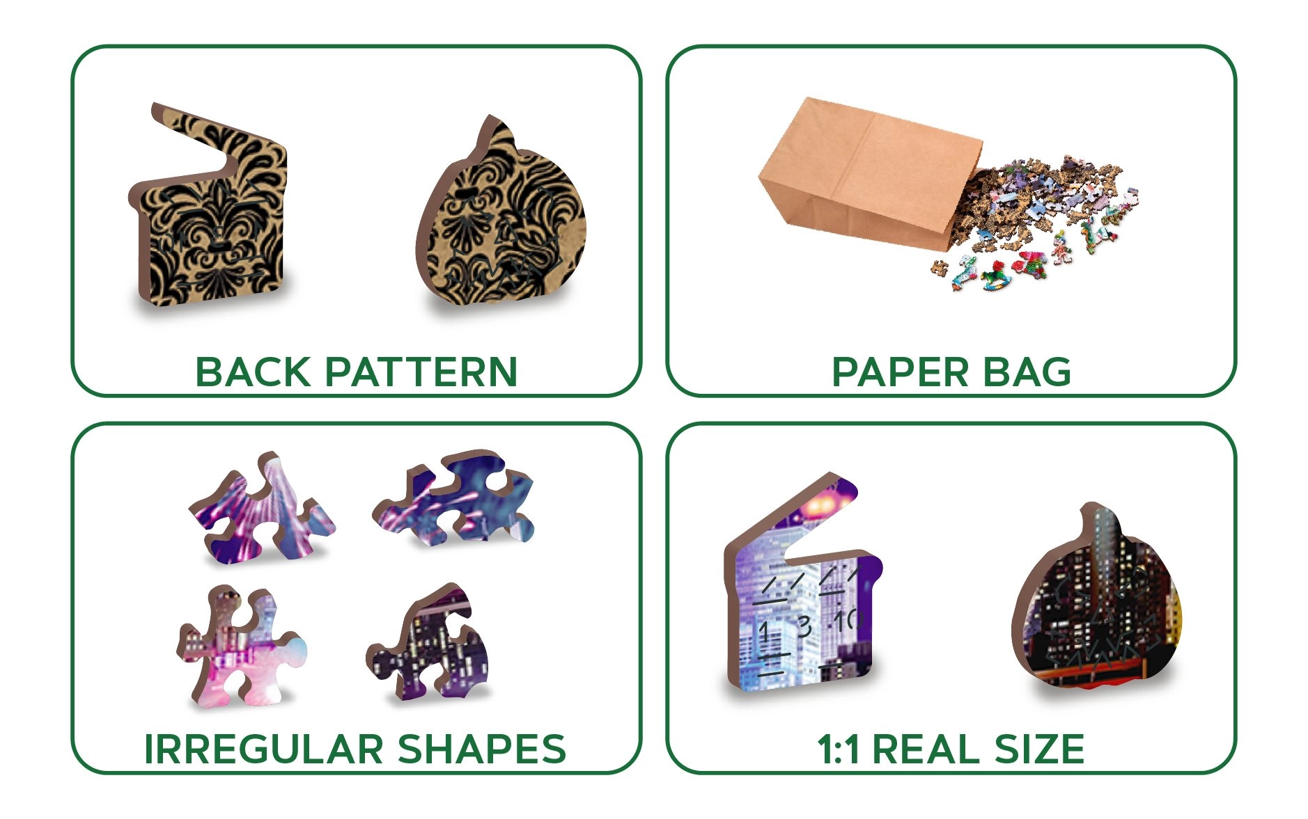 Duik in prachtige uitdagingen met onze dubbelzijdige houten puzzel Nachtelijk New York 2-in-1. Laser-gesneden details garanderen gladde randen zonder splinters en de hoogste verwerkingsprecisie: