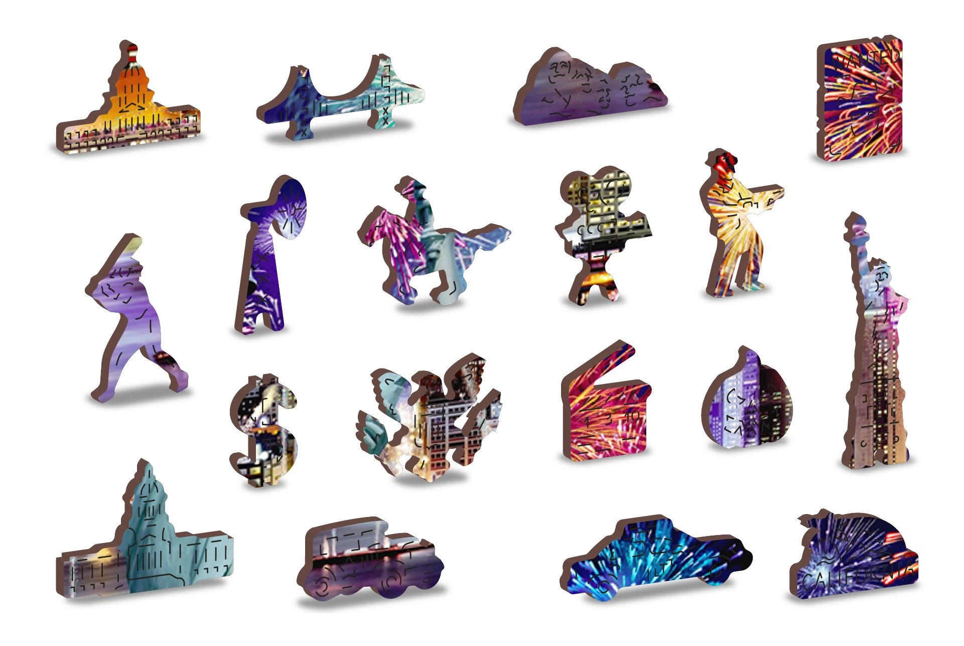 Ga op reis naar het nachtelijke New York met onze luxe 2-in-1 houten puzzel. Zorgvuldig uitgesneden uit hoogwaardig materiaal, deze puzzel biedt unieke, gevormde stukjes die afzonderlijk dieren, objecten of gebouwen vormen, en is tegelijkertijd milieuvriendelijk.