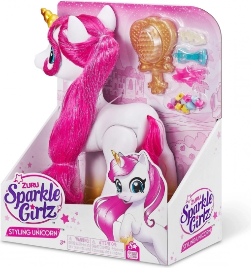 Ontdek de magie met de Sparkle Girlz eenhoorn van ZURU. Deze betoverende eenhoorn heeft prachtige ogen en lang, zacht haar dat je kunt kammen en versieren met de meegeleverde accessoires. Een flexibele kop maakt diverse poses mogelijk en verhoogt het speelplezier. Prikkel de fantasie en creativiteit van je kinderen met de borstel en verschillende haarversieringen.