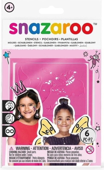 De set van zes hoogwaardige SNAZAROO-sjablonen maakt schminken op gezicht en lichaam gemakkelijk. Motieven zoals prinsessen, vlinders en feeën zijn ideaal voor kinderfeestjes, carnaval en thema-evenementen. De zelfklevende achterkant houdt de sjabloon precies waar je hem nodig hebt en het flexibele materiaal volgt perfect de contouren van gezicht en handen.